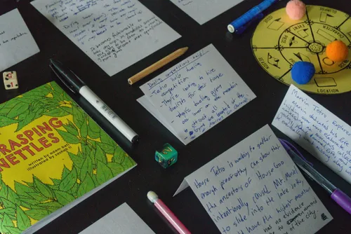 Grasping Nettles is a laid back game that feels expansive when you play. Moving on the wheel to start a turn provides just enough structure to bring out fun but small ideas from each player, building each turn into something bigger. Session length is player-driven, so you can play for for 30 minutes or you can spend all day building a world.