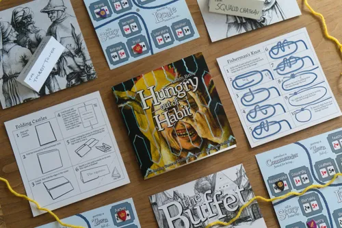 An anthology myth-making card game where excerpts from real books serve as random story prompts. The game gives a random page number & sentence to interpret from the books in play for every beat of each story. When a storyline ends, start the next one with a new book from the shelf!